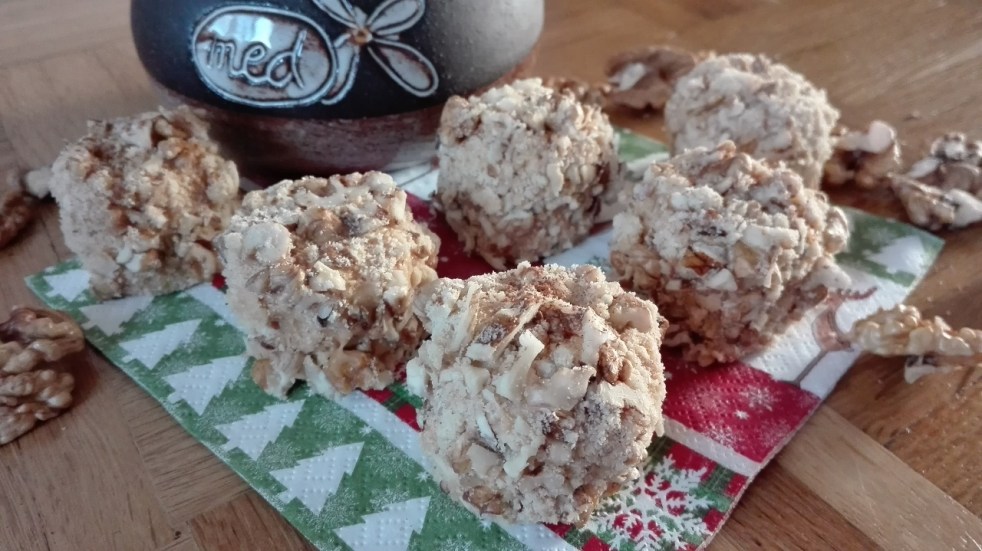 Na dokončení medovníčků si ještě připravíme silnou kávu, kterou smícháme s rumem a nasekané ořechy smíchané s rozdrcenými upečenými kolečky a skořicí. Množství na obalení je pouze orientační, záleží na velikosti koleček. Pokud vám směs dojde, jednoduše si ji přidělejte.