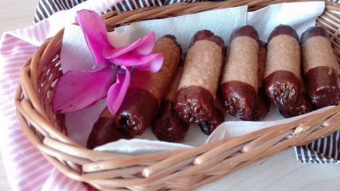 Trubičky naplníme krémem a jejich konce namáčíme do rozehřáté čokolády (čokoládu rozehříváme ve vodní lázni, můžeme do ní přidat trochu kokosového oleje, aby byla řidší).