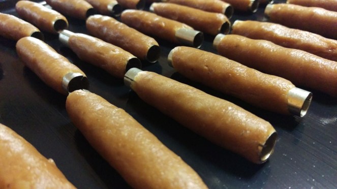 Trubičky pečeme ve vyhřáté troubě na 180 °C asi 10 – 15 minut. Hned po vyjmutí z trouby těsto opatrně stáhneme z trubiček a necháme vychladnout.
