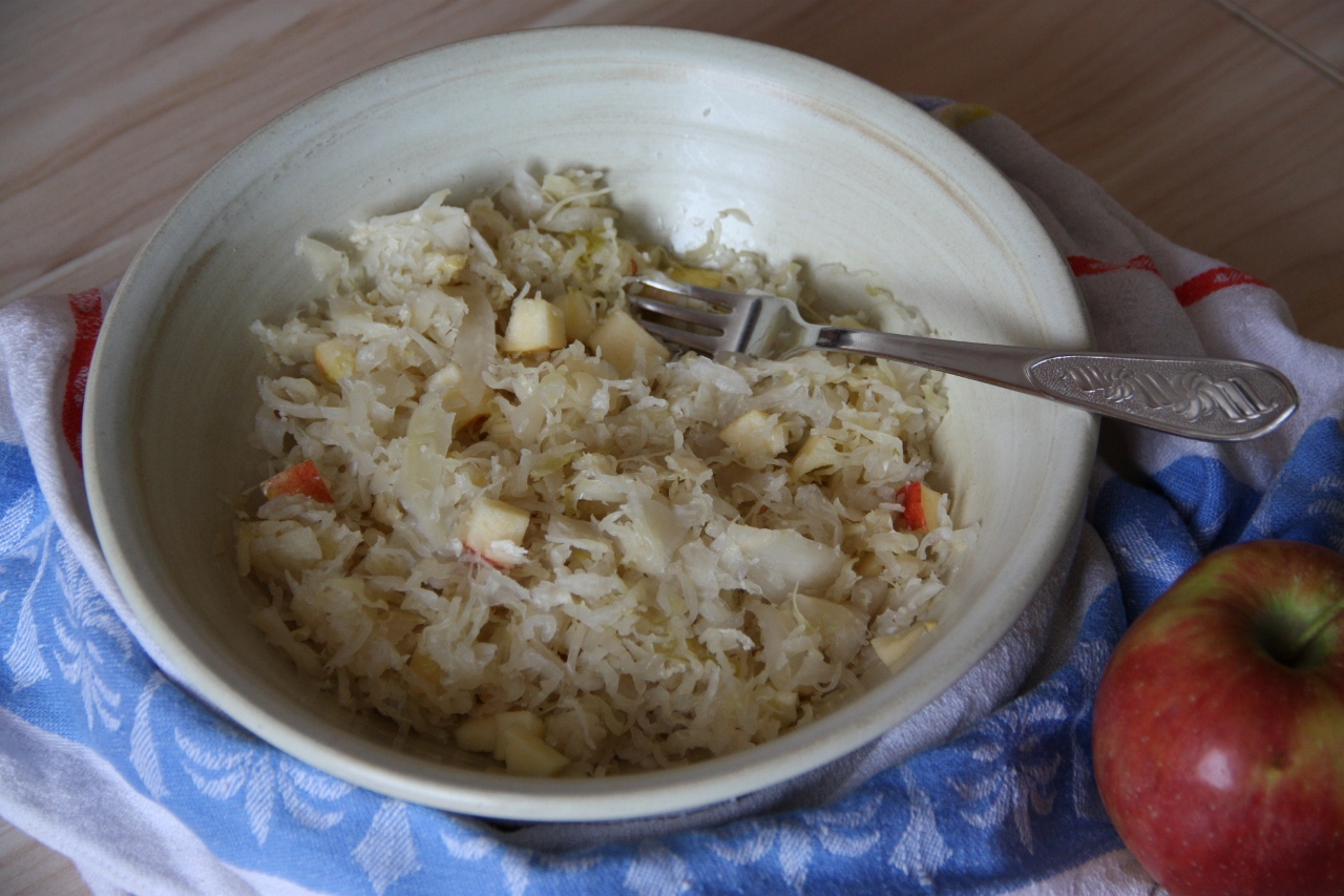 Kysané zelí jednoduše pokrájíme na menší kousky, přidáme kousek na kostičky nakrájeného jablka a nadrobno nastrouhaný křen (množství podle toho, jak kvalitní je křen, a taky, co kdo snese). Zamícháme a je hotovo. Jak jednoduché! A hodí se téměř k čemukoli, k masu, bramborám, zapečeným těstovinám, rizotu…