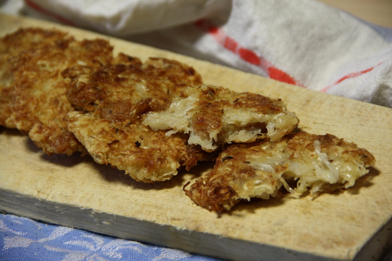 Všechno smícháme. Tvoříme placičky (je dobré si navlhčit ruce, aby se vám těsto nelepilo), které z obou stran smažíme na sádle.