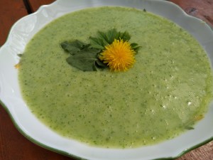 K bramborovému základu přidáme všechny bylinky (my jsme tentokrát zvolily kopřivu, kozí nohu, pampeliškové listy i pár květů, pár lístků šťovíku a sedmikrásku) a důkladně rozmixujeme. Osolíme a opepříme podle chuti, případně polévku zjemníme kouskem másla.