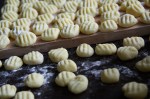 Z těsta po částech vyválíme vždy hada, nakrájíme na malé kousky a každý kousek lehce zakulatíme a rozplácneme vidličkou. Jaké tvary vytvoříte, záleží pouze na vás. Nemusí být vůbec pravidelné ani všechny stejné, v tom je právě jejich kouzlo. Připravené noky si dáme zatím stranou a připravíme si ostatní ingredience, protože to potom bude „rychlá akce“.
