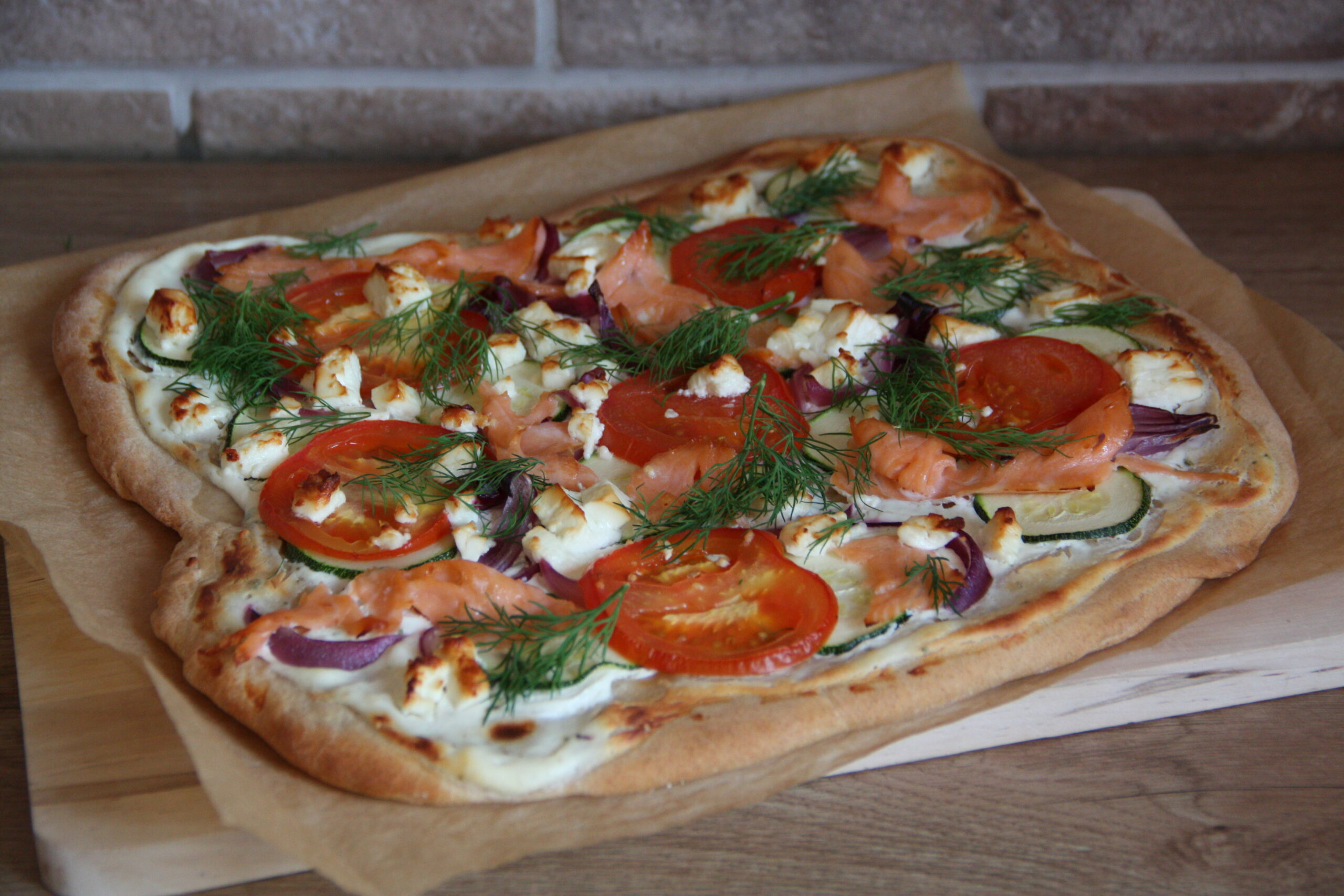 Vykynuté těsto rozdělíme na 4 části a rozválíme na co nejtenčí plát, který dáme na plech vyložený pečícím papírem. Vejdou se mi vždy dva pláty na jeden plech. Poté pláty potřeme připravenou směsí a poklademe vším, co máme rádi. Mně s tímto smetanovým základem nejvíce chutná červená cibule, cuketa, rajče, uzený losos a sýr feta.