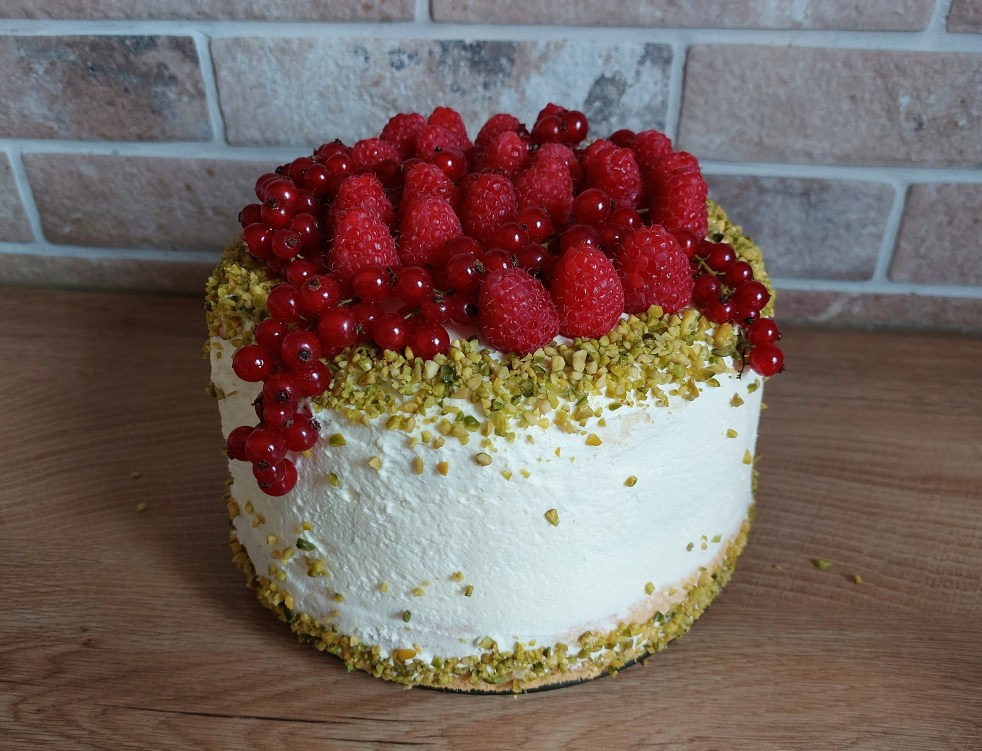 Celý dort pomažeme zbylým čokoládovým krémem, okraje posypeme pistáciemi a dozdobíme čerstvým ovocem. Dort dáme chladit do lednice.