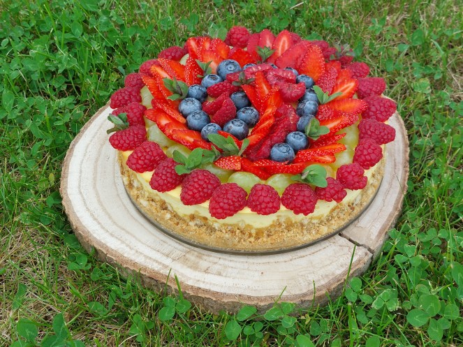 Náplň nalijeme na sušenkový základ a pečeme ve vyhřáté troubě na 180 °C asi 15 minut. Poté teplotu snížíme na 120 °C a dopékáme ještě asi hodinu.